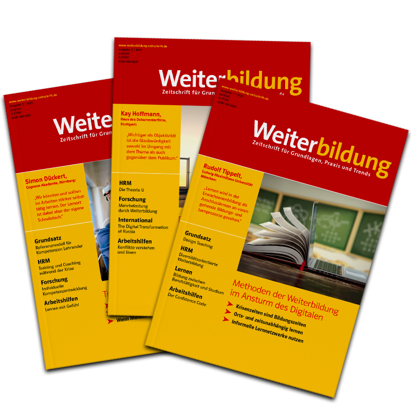 »Weiterbildung« ist der neue Titel der renommierten Fachzeitschrift »Grundlagen der Weiterbildung – GdWZ« und die einzige auf dem Markt erhältliche Zeitschrift, die die gesamte Themenbreite der Weiterbildung abdeckt. Optisch attraktiver und durchgängig farbig, setzt Weiterbildung auf Kontinuität. Die in der Vergangenheit etablierten hohen Standards werden auf gewohnte Weise fortgeführt.